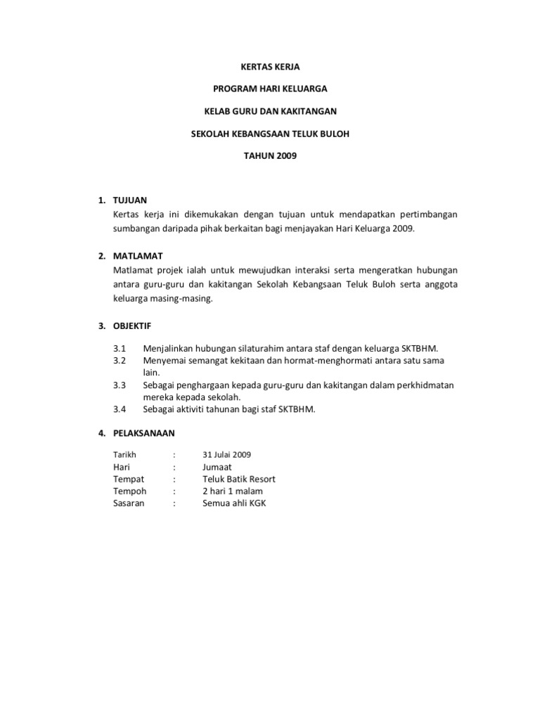 KERTAS KERJA PROGRAM HARI KELUARGA KELAB GURU DAN KAKITANGAN SEKOLAH KEBANGSAAN TELUK BULOH TAHUN 2009. Ini kerana institusi keluarga adalah saluran asas dalam pembentukan sikap nilai murni dan. DESARU GOLDEN BEACH HOTEL Tarikh.